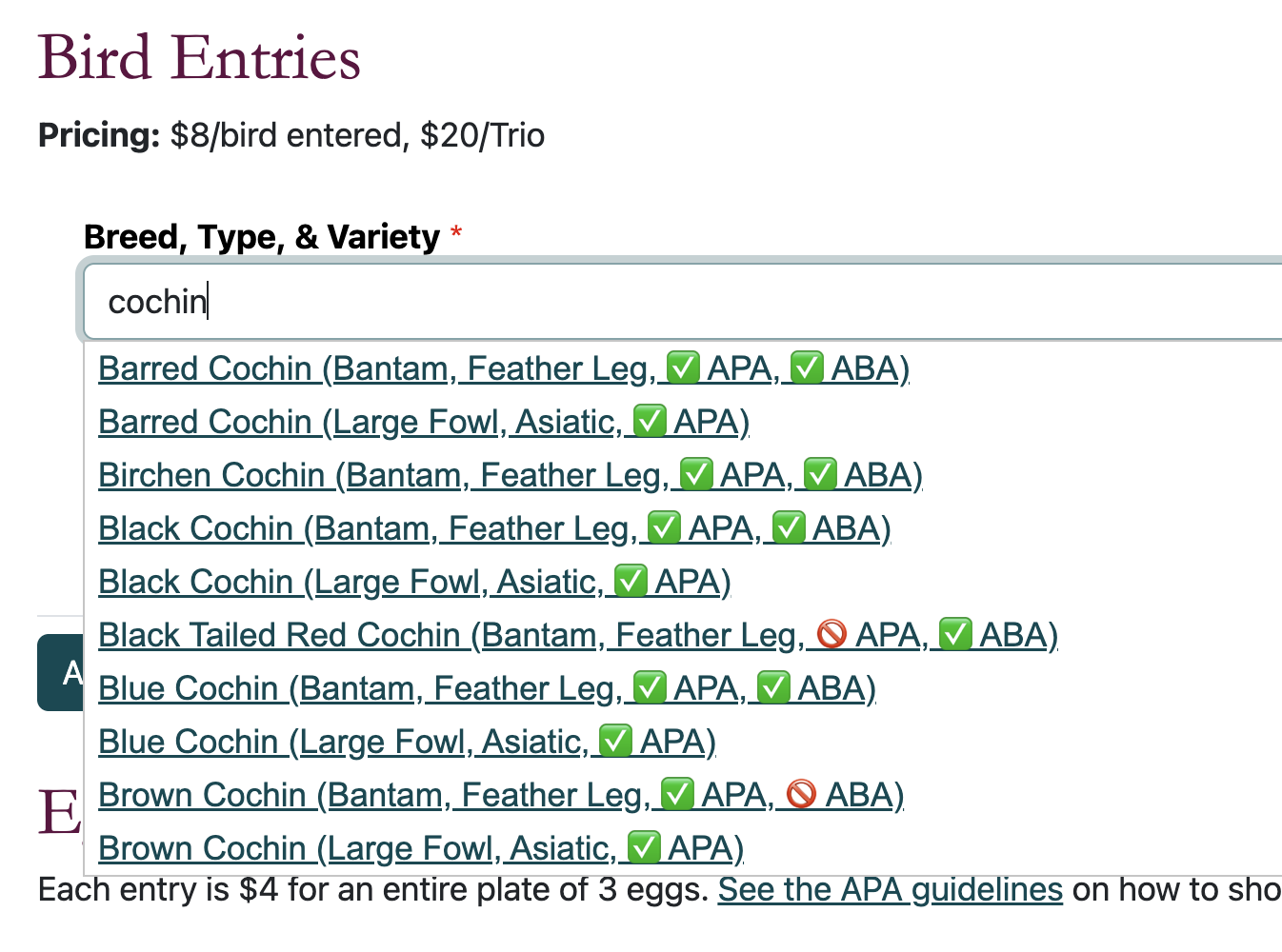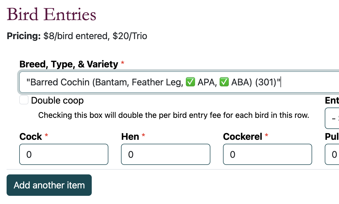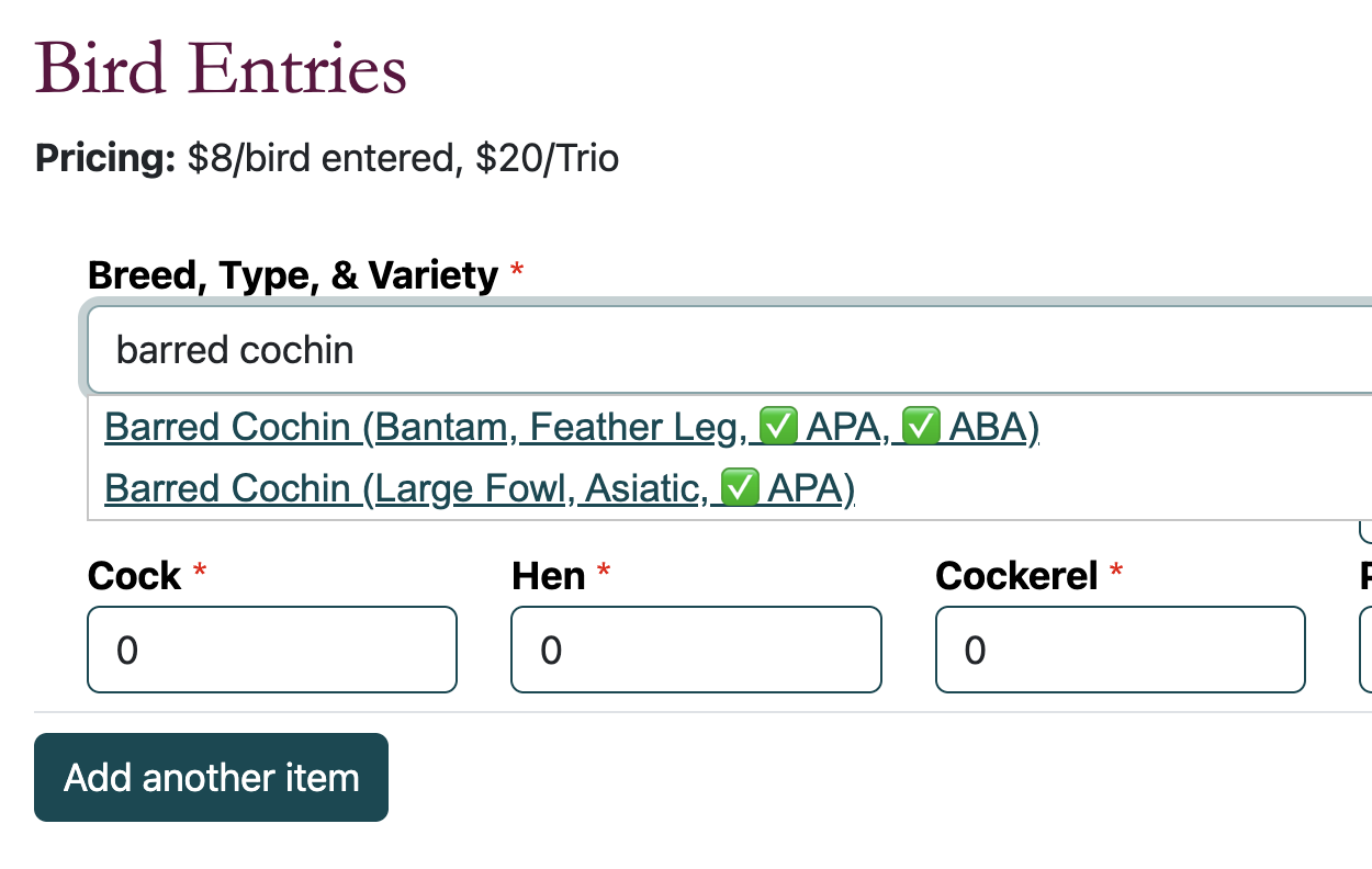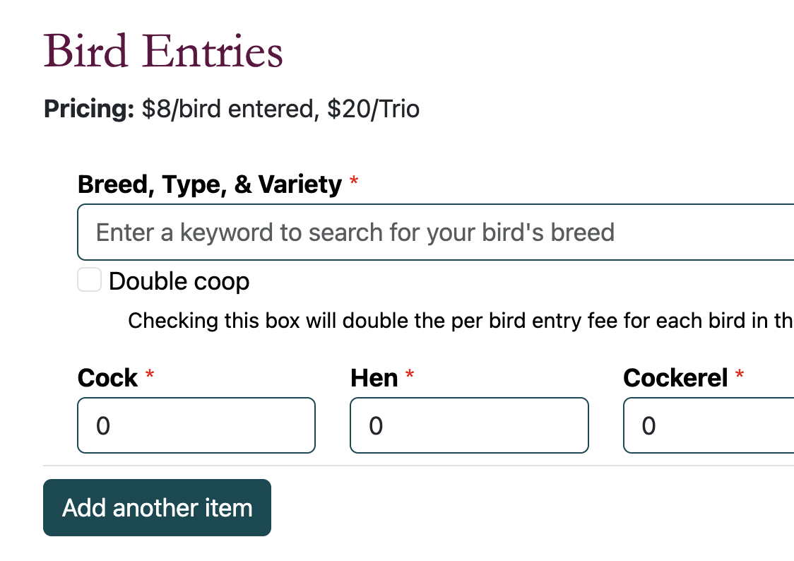 Our new online registration system helps us organize entries and understand how many birds (and what kinds!) are entered without having to do everything manually. This saves our club members a lot of time and prevents typing errors along the way.