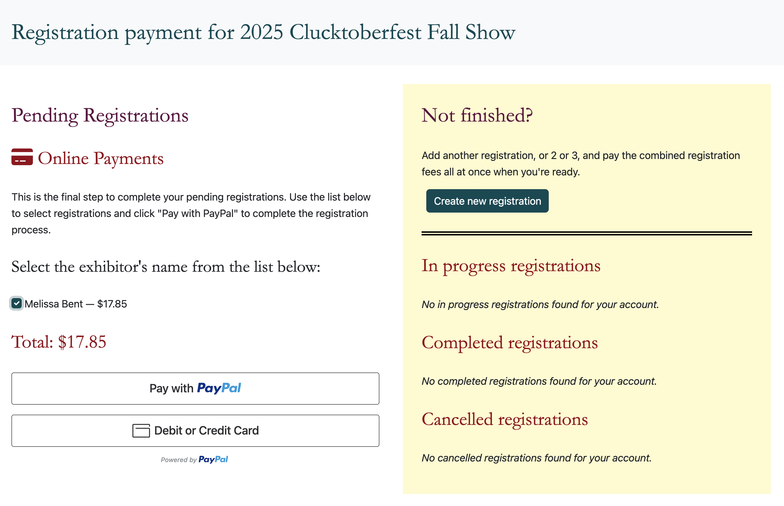 Checking the box next to the Exhibitor's name will add that pending registration to the "cart" for payment.