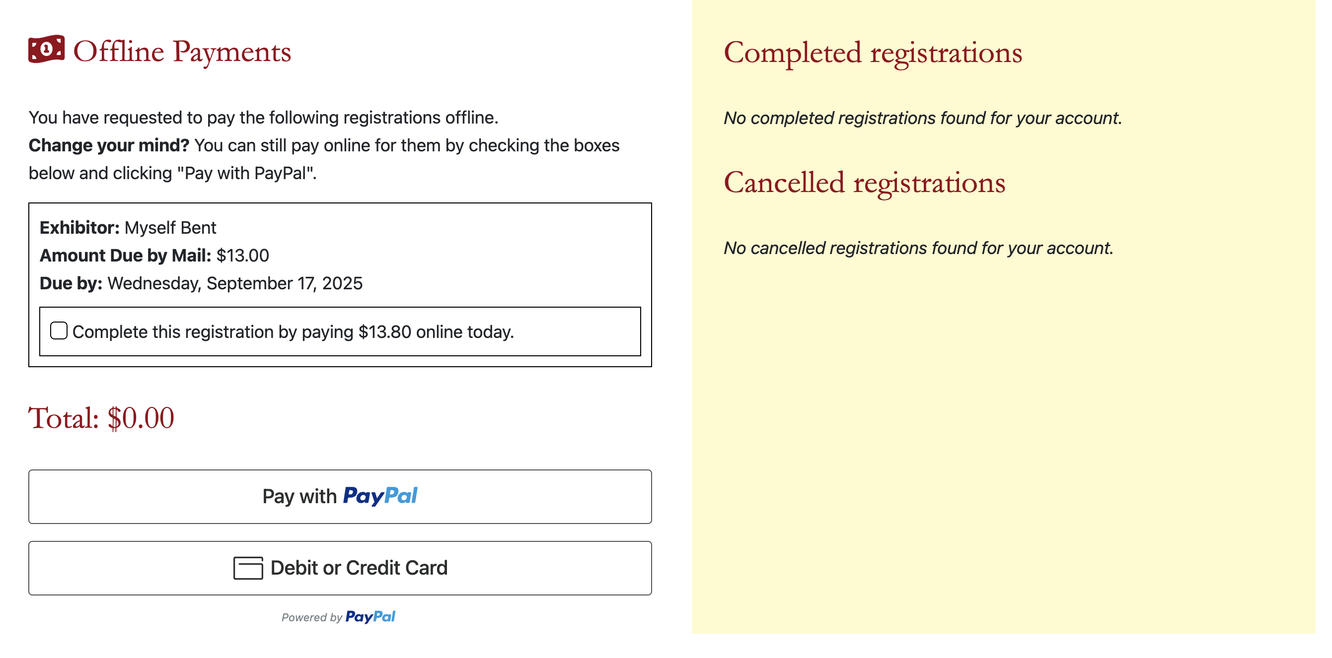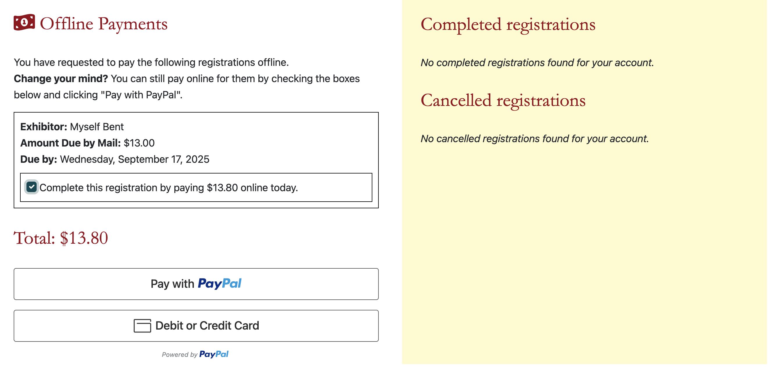 If selecting "Offline Payment", the registration will be displayed in a separate section: